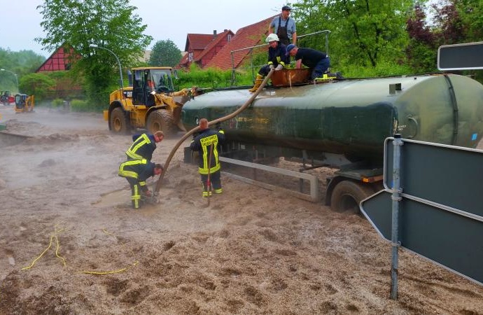 Liebenau – Am Mittwochabend gegen 18.00 Uhr kam es zu einem punktuellen Unwetter in Liebenau. Während es in der näheren Umgebung nur leicht regnete, sorgte über dem Ort ein Starkregen für eine Schlammlawine die sich in auf die Ortsmitte konzentrierte. Der Schlamm stand rund 20cm hoch auf den Straßen. Die zur Einsatzstelle gerufene Feuerwehr sorgte zunächst dafür, dass die verstopften Abwasserkanäle wieder frei wurden uns sicherten die Straße ab.