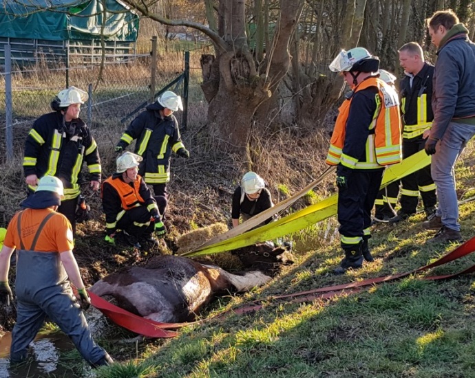 Wolfhagen – Am Freitagnachmittag gegen 15 Uhr wurde die Feuerwehr zu einem etwas ungewöhnlichen Einsatz gerufen. In Viesebeck war ein Pferd im Rauteweg in einen Bach geraten und gut einen Meter eingesunken. Das Tier hatte nicht mehr die Kraft sich aus der misslichen Lage selbst zu befreien. Die Kameraden und Kameradinnen der Feuerwehr versuchten zunächst das Pferd mittels B-Schläuche herauszuziehen, was jedoch nicht gelang.