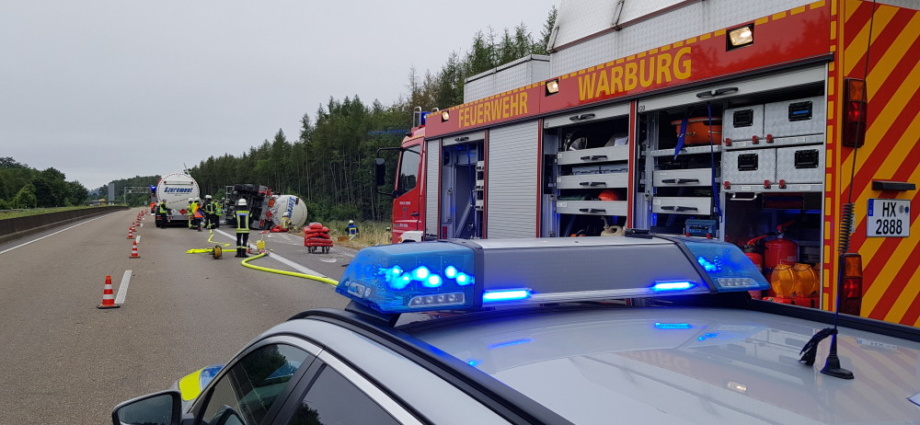 Warburg/Breuna – Gegen 07.20 Uhr krachte es auf der A44 zwischen Warburg und Breuna. Ein mit Heizöl beladener Sattelzug verunglückte und kippte auf die Seite. Was hier genau passiert ist steht derzeit noch nicht fest. Um eine mögliche Katastrophe zu verhindern musste der Tanksilo zunächst leer gepumpt werden, was jedoch Probleme mit sich brachte, denn der Auslauf zum abpumpen lag unter dem Auflieger. Die Feuerwehr musste dann den Tank anbohren um das Umpumpen zu ermöglichen.